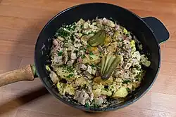 Hoppelpoppel – potrawa typowa dla niemieckiej kuchni chłopskiej, przyrządzana z odsmażonych ziemniaków, do których dodaje się na patelni roztrzepane jajka. Dodatkiem do potrawy może być także pokrojona w kostkę wędzonka. W innej wersji zamiast wędzonki dodaje się paprykę i pomidory.