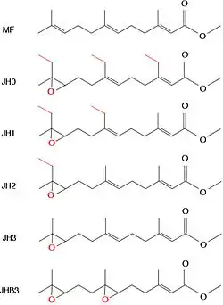 Nazwa „hormon juwenilny” opisuje w gruncie rzeczy grupę hormonów o podobnym działaniu i podobnej budowie chemicznej – wszystkie hormony juwenilne są pochodnymi terpenoidowymi posiadającymi jedną lub dwie grupy epoksydowe. U większości owadów występuje jedynie forma JH3, niemniej jednak u muchówek główną rolę odgrywa forma JHB3, zaś motyle wykorzystują kilka zróżnicowanych form (JH0, JH1, JH2 oraz JH3).