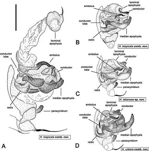 Nogogłaszczki samca mają na rzepce jedną, a u H. cucullus dwie szczecinki makroskopowe. Aparat kopulacyjny cechuje się m.in. pociągłym i hakowatym paracymbium, poprzecznie wydłużoną, pozbawioną dwupłatowego wyrostka apofyzą medialną o nasadzie łukowato zakrzywionej ponad radiksem i o płatowatym, rozdwojonym lub roztrojonym wierzchołku, prostym do sinusoidalnie zakrzywionego, pozbawionym „czapeczki” embolusem oraz pęcherzykowatą i zwężoną ku spiczastemu i zesklerotyzowanemu szczytowi apofizą terminalną. Ów szczyt apofizy terminalnej u przynajmniej części gatunków stowarzyszony jest u podstawy z drugą strukturą spiczastą. Embolus i szczyt apofizy terminalnej leżą w wykrojeniu po brzusznej stronie konduktora. Płat konduktora jest dobrze wykształcony, wydłużony, acz mniejszy niż u Novakiella, zakończony zaokrągloną szpatułką o dobrzusznie odgiętym szczycie, porośniętą łuskowatymi strukturami. Sam konduktor podzielony jest na część błoniastą i zesklerotyzowaną. Z wyjątkiem H. lodicula nieobecny jest płat lub guzek tegularny[1].
