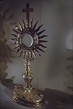 - wielka hostia – w czasie Eucharystii jest spożywana przez celebransa jako Ciało Zbawiciela po transsubstancjacji, czyli przeistoczeniu, a w trakcie nabożeństw jest umieszczana w monstrancję jako cel adoracji[1][2][4][6],