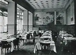Powyżej, na piętrze (technicznie rzecz ujmując – na antresoli, czy jak pisano w czasach budowy hotelu – międzypiętrzu), na wysokości 5,20 metra nad poziomem ulicy, ulokowano hotelową restaurację[12]. Sala główna miała powierzchnię użytkową ok. 200 metrów kwadratowych. Na tym samym poziomie znalazły się także zmywalnie, pomieszczenia gospodarcze, bufet, toalety, a także stanowisko elektrycznych wind dowożących potrawy z kuchni[12]. Poza obrys budynku, na półtora metra, wystawała ciągnąca się na całą szerokość budynku przeszklona weranda z kutego żelaza[12]. Wystroju sali głównej dopełniało 250 żarówek elektrycznych[12].