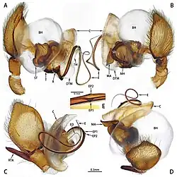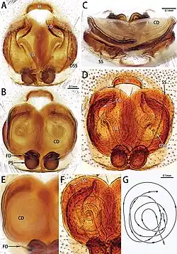 Genitalia samicy mają podługowato-owalną płytkę płciową z kapturkiem utworzonym przez przednie fałdy oraz dużymi i środkowo-bocznie umieszczonymi otworami kopulacyjnymi, długie i na przedzie prawie dwukrotnie szersze od spermatek pierwotnych przewody kopulacyjne zataczające w przednim i środkowym biegu okrąg, małe i kuliste wspomniane spermateki pierwotne oraz niewielkie spermateki wtórne[1].