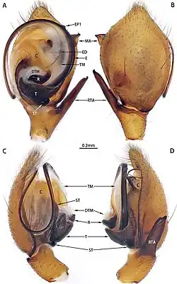 Nogogłaszczki samca mają niezmodyfikowane udo i rzepkę, goleń zaopatrzoną w prawie dwukrotnie dłuższą od niej apofizę retrolateralną o zakrzywionym przednio-bocznie szczycie oraz gruszkowate cymbium o wierzchołku pozbawionym kolców. Hematodocha bazalna jest duża i dobrze wykształcona, natomiast hematodocha medialna mała. Większe od subtegulum tegulum ma osadzoną na tylno-bocznym wierzchołku, prawie dwukrotnie szerszą od niego, zakrzywioną i spiczastą apofyzę medialną, osadzony przednio-bocznie, duży, słabo zesklerotyzowany, półksiężycowaty, na krawędzi pogrubiony konduktor oraz osadzony między siódmą a ósmą godziną, długi, w części nasadowej skręcony w stronę przeciwną do ruchu wskazówek zegara embolus z wyposażoną w dwa wyrostki embolarne, w trakcie kopulacji rozdętą błoną terminalną. Odsiebna błona rurkowata łączy tegulum z radiksem i w czasie kopulacji rozdyma się do postaci kulistej. Przewód wytryskowy jest wyraźnie widoczny[1].