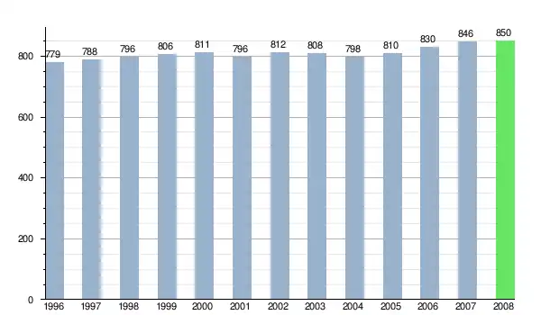 Według danych z dnia 31 grudnia 2012, wieś zamieszkiwały 954 osoby, w tym 498 kobiet i 456 mężczyzn[6].