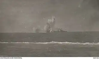 - ↑ Według niektórych publikacji, ostrzelał pancernik prowadząc do jego poddania (A. Doniec Gołłandskie...), jednak częściej spotykana w literaturze jest wersja ataku lotnictwa na pancernik.