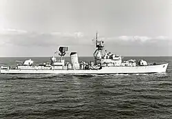 - ↑ Tak według Conway’s All the world’s fighting ships 1947–1995 ↓, s. 273 i Jane’s Fighting Ships 1975-76 ↓, s. 245, natomiast Cabo 1995 ↓, s. 29 podaje załogę 246 osób