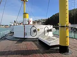 - 1 działo odtylcowe 76 mm w stanowisku na lewej burcie