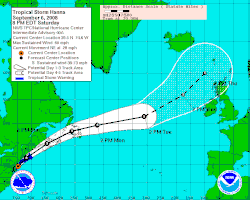 Hanna to ósmy sztorm z nazwą własną, czwarty huragan na Atlantyku w roku 2008. Przechodząc 330 km na wschód od stolicy Bahamów, Nassau, huragan osłabł nieznacznie nad wodami na wschód od Florydy, przechodząc z I kategorii na skali Saffira-Simpsona do rangi sztormu tropikalnego. Zmierzał płaskim łukiem w kierunku północno-wschodnim wzdłuż Wybrzeża Atlantyckiego, po najściu obu Karolin pomiędzy Myrtle Beach i Wilmington (Karolina Północna) o 03:20 czasu lokalnego. Spodziewane ponowne wzmocnienie z powrotem do rangi huraganu nie nastąpiło. Pomimo jego wielkiej rozległości obszarowo (burza o średnicy ponad 330 km), jako szybko przemieszczający się sztorm został oceniony jako stosunkowo mało groźny powodziowo dla USA i Kanady, natomiast potencjalnie katastrofalny pod względem erozji plaży.
