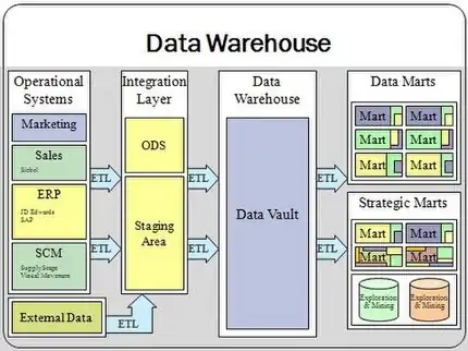 - Źródło danych – bazy danych przedsiębiorstwa, najczęściej relacyjne. Dane o zróżnicowanej jakości, strukturze logicznej, a także wielkości danych; do warstwy tej należą przede wszystkim bazy danych systemów ERP (ang. Enterprise Resource Planning) oraz MRP (ang. Material Requirements Planning).