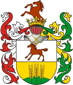 Na tarczy dzielonej w pas, w polu górnym, srebrnym, koń w galopie, cisawy, w polu dolnym, złotym trzy takież kłosy na pagórku zielonym.
