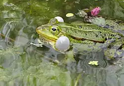 - ↑ Holenweg Peter A.K.. Dispersal rates and distances in adult water frogs, Rana lessonae, R. ridibunda and their hybridogenetic associate R. esculenta. „Herpetologica”. 57 (4), s. 449–460, 2001. Herpetologists' League.