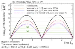 Porównanie prawdopodobieństw pojawiania się neutrin i antyneutrin elektronowych (Pνμ→νe i Pνμ→νe) pozwala zmierzyć fazę δCP. Zakres δCP wynosi od -π do π (od -180° do 180°), a 0 i ±π odpowiadają zachowaniu symetrii CP. Oczekuje się, że po 10 latach zbierania danych HK potwierdzi na poziomie ufności 5σ lub więcej, czy symetria CP jest naruszana w oscylacjach neutrin dla 57% możliwych wartości δCP. Naruszenie symetrii CP jest jednym z warunków niezbędnych do wytworzenia nadmiaru materii nad antymaterią we wczesnym Wszechświecie, który to nadmiar obecnie tworzy nasz zbudowany z materii Wszechświat. Neutrina akceleratorowe zostaną również wykorzystane do zwiększenia precyzji innych parametrów oscylacyjnych |∆m232|, θ23 i θ13, a także do badań oddziaływań neutrin[3].