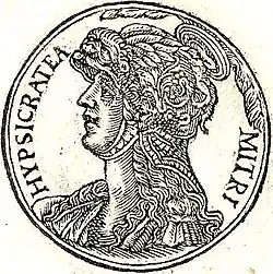 Królowa Hypsykratia niezwykle kochała męża – to dla niego porzuciła zacny blask jej urody niewieściej i przejąwszy męski strój w wojnę mu towarzyszyła. Obcięła swoje piękne włosy i do konia i broni tak przywykła, że mogła odtąd dzielić jego trudy i zwycięstwa. Gdy został pokonany przez wielkiego Pompejusza, towarzyszyła mu w wygnaniu i w ciele i w duchu nieporuszonym. Jej niezwykła wierność była dla Mitrydatesa największą osłodą wygnania[1].