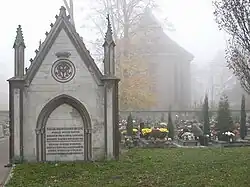 ↑ W mauzoleum pochowane są córki grafa Friedricha Augusta von Kospoth z Borowego, hrabianki Marianna (1848-1869) i Dorothea (1862-1892). Były one kolejno żonami Leopolda Friedricha grafa von Rothkirch freiherra v. Trach z Niedźwiedzic. Widoczna wschodnia fasada zawiera inskrypcje nagrobne obu sióstr: