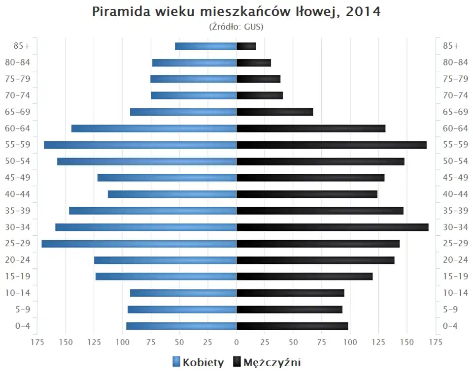 Piramida wieku mieszkańców Iłowej w 2014 roku[52].