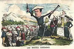 - ↑ karykatura z roku 1870, przedstawiająca karlistowską propagandę religijno-polityczną. Rzecz dzieje się w wiejskich rejonach podpirenejskich, a agitację prowadzi uzbrojony po zęby ksiądz katolicki. Za nim przy ołtarzu, oznaczonym karlistowskim hasłem "Bóg, Ojczyzna, Król", stoja katolicki hierarcha i żołdak. Pogrążony w zasłuchaniu lub egzaltacji tłum (w charakterystycznych dla ruchu, czerwonych i białych beretach), przedstawiony jest jako stado baranów. Akcenty antyreligijne są stonowane, poza przedstawicielami kleru brak jest symboli religijnych. Trudno powiedzieć czy karlistowski pretendent Karol VII przedstawiony jest jako postać stojąca na ołtarzu, czy raczej jako głowa wychylająca się z francuskiej strony Pirenejów