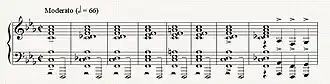 Druga część rozpoczyna się następstwem wolnych akordów w smyczkach modulujących z c-moll do E-dur. Fortepian wchodzi z prostym, arpeggiowanym motywem. Temat główny jest prezentowany przez flet, zanim zostanie rozwinięty w wirtuozowskim solo klarnetu. Fortepian i inni soliści wymieniają się motywem, aż muzyka koncentruje się w małej kulminacji na fortepianie. Główny temat jest powtórzony i muzyka zamiera pozostawiając tylko solistę kończącego w E-dur.