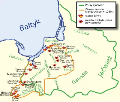 - ↑ Marian Biskup, Gerard Labuda: Dzieje Zakonu Krzyżackiego w Prusach. Gdańsk: Wydawnictwo Morskie, 1986, s. 182. ISBN 83-215-7220-0.