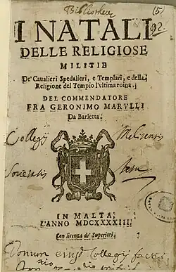 I Natali delle Religiose Militie – publikacja z 1643 roku autorstwa Geronima Marulliego, najstarsza znana książka drukowana wydana na Malcie.