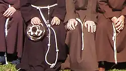 Strój zakonny to czarny lub szary habit z kapturem przepasany białym sznurem.