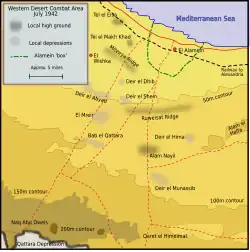 Samo Alamein było nieistotnym dworcem kolejowym na wybrzeżu Morza Śródziemnego. Około 16 km na południe od niego leżało Wzgórze Ruweisat, niskie, kamieniste wzniesienie, które zapewniało doskonały punkt obserwacyjny na wiele kilometrów na otaczającą go pustynię; 32 km na południe znajdowała się depresja Kattara. Linia, którą Brytyjczycy wybrali do obrony, rozciągała się między morzem a depresją, co oznaczało, że Rommel mógł ją oskrzydlić tylko poprzez znaczne zboczenie na południe i marsz przez Saharę. Armia brytyjska w Egipcie rozpoznała teren już przed wojną i kazała 8 Armii rozpocząć budowę kilku „stref” (miejscowości z okopami otoczonych polami minowymi i drutem kolczastym), z których najbardziej rozbudowane znajdowały się wokół stacji kolejowej w Alamein[12]. Większość „linii” stanowiła otwarta pustynia[13]. Gen. por. William Norrie (dowódca generalny XXX Korpusu) zorganizował pozycję i rozpoczął budowę trzech bronionych „stref”. Pierwsza i najsilniejsza, w El Alamein na wybrzeżu, została częściowo odrutowana i zaminowana przez 1 Dywizję Południowoafrykańską. Strefa Bab el Qattara – około 32 km od wybrzeża i 13 km na południowy zachód od grzbietu Ruweisat – została okopana, ale nie została odrutowana ani zaminowana, podczas gdy w polu Naq Abu Dweis (na skraju depresji Kattara), 55 km od wybrzeża, wykonano jeszcze mniej prac[13].