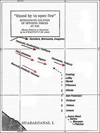 Japoński zespół nadpłynął w nocy, podobnie jak w poprzednich starciach, kanałem między północnym brzegiem Guadalcanalu a wysepką Savo. 13 listopada Amerykanie wykryli japońskie okręty około 1.20, za pomocą radaru krążownika „Helena”, z odległości około 13 km i przygotowywali się do walki, aczkolwiek amerykański okręt flagowy „San Francisco” miał problemy z własnym radarem i musiał polegać na łączności radiowej, borykając się z zakłóceniami. Amerykański zespół płynął kontrkursem na północny zachód w szyku torowym: 4 niszczyciele (USS „Cushing”, „Laffey”, „Sterett”, „O’Bannon”), krążowniki „Atlanta”, „San Francisco”, „Portland”, „Helena”, „Juneau” i reszta niszczycieli („Aaron Ward”, „Barton”, „Monssen”, „Fletcher”). Prawdopodobnie admirał Callaghan zamierzał przegrodzić swoim zespołem kurs Japończyków, podobnie jak w bitwie koło przylądka Esperance. O godzinie 1.40 w nocy, na wschód od Savo, czołowe amerykańskie niszczyciele i „Atlanta” natknęły się na 2 japońskie niszczyciele „Yudachi” i „Harusame” i wykonały zwrot w lewo. Japończycy dowiedzieli się w ten sposób o obecności przeciwnika, lecz mimo to, w ciągu najbliższych kilku minut amerykański głównodowodzący nie zdecydował się otworzyć ognia, prawdopodobnie z powodu zamieszania w amerykańskiej łączności i niekompletności posiadanych informacji w obliczu rozproszenia japońskiego zespołu, tracąc przez to przewagę wynikającą z posiadania radaru.