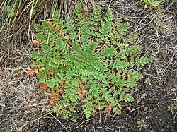 - Odziomkowe o ogonkach krótszych od blaszek tworzą rozetę, liście łodygowe wyrastają naprzemianlegle i ku górze są coraz mniejsze. Mają nieparzystosieczne blaszki liściowe o odcinkach krótkoogonkowych lub siedzących i głęboko podwójnie pierzastodzielnych[6].