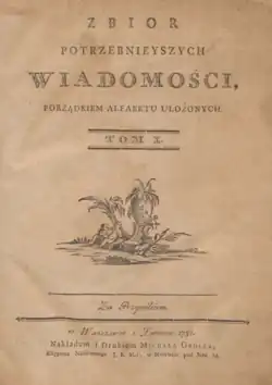 - Zbiór potrzebniejszych wiadomości, porządkiem alfabetu ułożonych[23], wydano t. 1-2, Warszawa 1781 (-początek 1783); redakcja I zakończona 20 września 1777 w Heilsbergu; uzupełnień do wydania dokonali różni autorzy, głównie K.H. Szembek, biskup płocki; z egzemplarza interfoliowanego i uzupełnionego ręką autora – reedycji dokonał A. Jakubowski