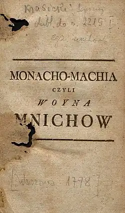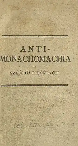 - Antymonachomachia, powst. 1779–1780; wydano pt. Anti-Monochomachia w sześciu pieśniach (Warszawa 1780)