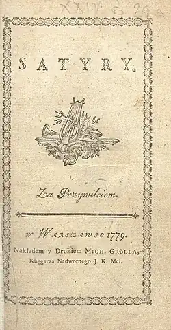 - Satyry[21] tzw. część 1 (zawiera: Do króla; Świat zepsuty; Złość ukryta i jawna; Szczęśliwość filutów; Marnotrawstwo; Oszczędność; Pijaństwo; Przestroga młodemu; Żona modna; Życie dworskie; Pan niewart sługi; Gracz; Odwołanie) powst. 1778–1779; wyd. Warszawa 1779 (2 wydania); tzw. część 2 (zawiera: Pochwała milczenia; Pochwała wieku; Pochwała głupstwa; Wziętość; Człowiek i zwierz; Klatki; Mędrek; Małżeństwo; Podróż) powst. 1781–1784; przekłady: czeski, niemiecki 1788, rosyjski