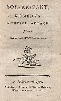 - ↑ Ignacy Krasicki, Solennizant : komedya w trzech aktach, wyd. 1780 [online], polona.pl [dostęp 2018-03-01].