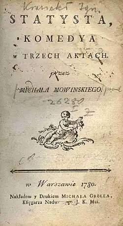 - Statysta, powst. około roku 1779; wyst. Warszawa 1780; wydano pt. Statysta. Komedia w 3 aktach, przez Michała Mowińskiego, Warszawa 1780