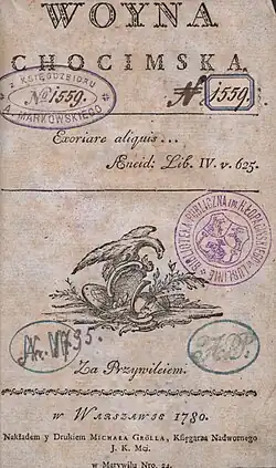 - ↑ Ignacy Krasicki, Woyna chocimska, wyd. 1780 [online], polona.pl [dostęp 2018-03-01].