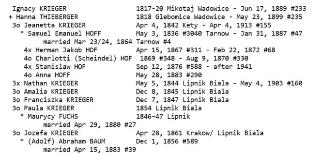 - ↑ Datę 1820 podaje np. Polski Słownik Biograficzny, s. 30, oraz Teresa Kwiatkowska, Andrzej Malik, Zespół negatywów szklanych z zakładu fotograficznego rodziny Kriegerów w posiadaniu Muzeum Historycznego miasta Krakowa, „Krzysztofory” 1984, nr 11, s. 51. Rok 1817 podaje: Eugeniusz Duda, Ignacy Krieger [w:] Krakowianie. Wybitni Żydzi krakowscy XIV-XX w., s. 148.