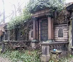 Tu spoczywa / mistrz murarski / Ignatz Grünfeld / ur. 11 stycznia 1825 / zm. 27 grudnia 1894 / Kto szuka prawości, dobroci, ten znajdzie życie, powodzenie i chwałę./ [Prz] 21,21