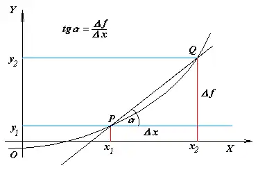 Rysunek przedstawia interpretację geometryczną ilorazu różnicowego dla dwóch punktów Prostą nazywa się sieczną lub cięciwą.