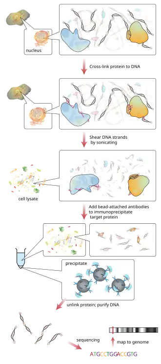 - Fragmentację. Kompleksy DNA-białka przecinane są na fragmenty ok. 400-500 bp[3] za pomocą sonikacji lub enzymatycznego trawienia nukleazami. W przypadku stosowania sonikacji próbkę umieszcza się w lodzie i stosuje kilka-kilkanaście cykli sonikacji z przerwami na ochłodzenie. Na ogół nie stosuje się enzymatycznych metod fragmentacji po stosowania formaldehydu[2].