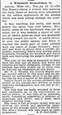 W latach 1896–1897 w Stanach Zjednoczonych odnotowano wiele obserwacji niezidentyfikowany obiektów latających, wyglądem przypominających sterowce. Jedna z tych obserwacji została opisana w wydaniu „Dallas Morning News” z 19 kwietnia 1897 roku autorstwa S.E. Haydon.