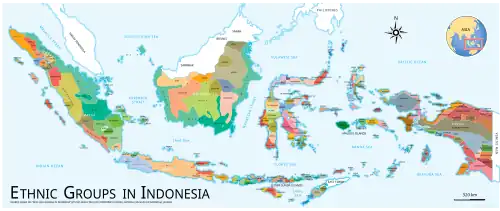 Na terenie Indonezji występuje ok. 300 autochtonicznych grup etnicznych[2], należą do nich m.in.: Jawajczycy, Sundajczycy, Malajowie, Bugijczycy, Batakowie, Bandżarowie, Madurowie, Makasarczycy[3]. Większa część Indonezyjczyków wywodzi się z ludów austronezyjskich, które prawdopodobnie wyemigrowały z obszaru dzisiejszego Tajwanu. Wschodnią część kraju, tj. zachodnią Nową Gwineę, a po części także wyspy Moluki i prowincję Małe Wyspy Sundajskie Wschodnie, zamieszkują ludy melanezyjskie[4][5]. W szerszym ujęciu do Indonezyjczyków zalicza się także ludność napływową: Chińczyków, Arabów, Indusów, Europejczyków[3]. Pomimo ogromnej różnorodności etnicznej zakorzeniło się poczucie przynależności do jednego narodu indonezyjskiego[6].