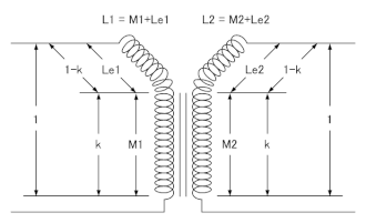 Dla cewek o indukcyjnościach L1 i L2 i indukcyjności wzajemnej M indukcyjności rozproszenia transformatora widziane od strony każdej z nich są dane wzorami: