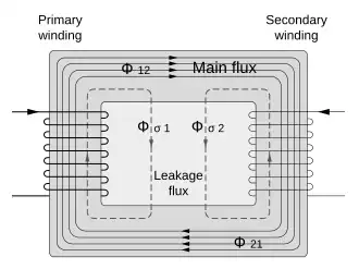 - dla transformatora zbudowanego z tych cewek, dla którego określa się np. "indukcyjność rozproszenia widziana od strony uzwojenia 1". Ta ostatnia jest indukcyjnością, jaką miałoby uzwojenie 1, gdyby uzwojenie 2 miało zerowy opór i zostało zwarte. Do indukcyjności rozproszenia transformatora dają wkład indukcyjności rozproszenia obu uzwojeń.
