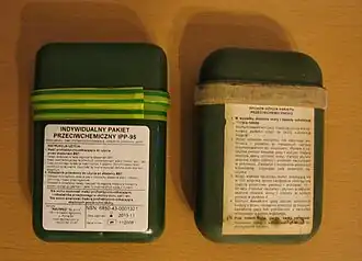 W skład pakietu wchodzą także cztery serwetki z gazy bawełnianej (gaziki) do usuwania ciekłych substancji trujących i przecierania odkażanych powierzchni.