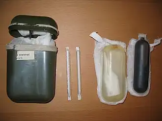 - Naczynie o pojemności 40 cm³ z 15% roztworem krezolanu sodu w 96% alkoholu etylowym. Roztwór ten służy do neutralizacji związków fosforoorganicznych, na przykład sarinu, somanu, tabunu, poprzez zasadową hydrolizę.