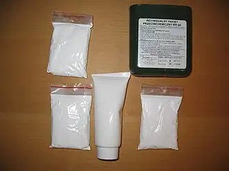 - trzy woreczki zawierające około 25 g absorbentu krzemianowego (chemosorbentu zeolitowego). Każdy woreczek ma zamknięcie strunowe. Proszek ten służy do absorpcji substancji trujących ze skóry i wyposażenia żołnierza.