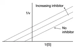 Kompleks związany z inhibitorem tworzy się głównie przy wysokich stężeniach substratu, ale nie może on uwalniać produktu, co powoduje zmniejszenie Vmax w stosunku do reakcji nieinhibowanej. Pozorne powinowactwo enzymu do substratu jest zwiększone (Km jest mniejsze) w stosunku do reakcji wyjściowej. Dzieje się tak dlatego, że kompleks związany z inhibitorem skutecznie zmniejsza stężenie kompleksu enzym-substrat. Zgodnie z regułą Le Chateliera-Brauna następuje przesunięcie równowagi chemicznej reakcji w stronę utworzenia dodatkowych kompleksów enzym-substrat, co skutkuje mniejszą ilością wolnego enzymu i większą ilością enzymu w formach ES i ESI[2].