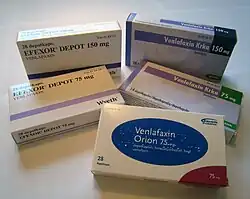 Keith Hawton, Helen Bergen, Sue Simkin, Jayne Cooper i inni. Toxicity of antidepressants: Rates of suicide relative to prescribing and non-fatal overdose. „The British Journal of Psychiatry”. 196 (5), s. 354–358, 2010. DOI: 10.1192/bjp.bp.109.070219. PMID: 20435959. PMCID: PMC2862059. - ↑ Marian Christoph, Bernd Ebner, Dirk Stolte, Karim Ibrahim i inni. Broken heart syndrome: Tako Tsubo cardiomyopathy associated with an overdose of the serotonin-norepinephrine reuptake inhibitor Venlafaxine. „European Neuropsychopharmacology”. 20 (8), s. 594–597, 2010. DOI: 10.1016/j.euroneuro.2010.03.009. PMID: 20451358.