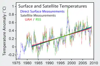 Instrumentalne pomiary temperatury są jednym z głównych źródeł informacji o klimacie w XIX i XX wieku. Począwszy od lat 70' XX wieku dysponujemy satelitarnymi pomiarami promieniowania podczerwonego, które można wykorzystać do wyliczenia temperatury. Ze względu na to, że promieniowanie pochodzi z całej atmosfery a nie tylko samej powierzchni Ziemi, to są one obarczone sporymi niepewnościami. Dodatkowo obliczenia temperatury na podstawie promieniowania muszą uwzględniać takie czynniki jak np. zmianę wysokości satelity. Temperaturę we wcześniejszym okresie można szacować na podstawie danych pośrednich (ang. proxy)[5]. Strona internetowa[6] National Oceanic and Atmospheric Administration zawiera szczegółowe wyniki rokrocznych pomiarów temperatury lądu i oceanów od 1880[7]. Tabela po prawej stronie przedstawia 10 najcieplejszych lat w historii pomiarów instrumentalnych wg danych NOAA, w trzeciej kolumnie umieszczono średnią anomalię temperatury dla poszczególnych lat względem średniej z XX wieku.