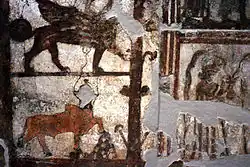 Po obu stronach centralnych panneau znajdują się wizerunki sześciu zwierząt – po trzy z każdej strony, umieszczone jedno nad drugim. Nad nimi znajdują się cherubiny. Dolnym zwierzęciem jest byk, który wspiera nogę na wzgórku. W dolnych narożnikach malowidła umieszczono adorujące bóstwa – po jednym w każdym kącie. Kompozycja z jednej strony – zwierzęta, adorujące bóstwa, drzewa – jest lustrzanym odbiciem układu postaci z drugiej.