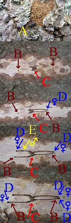 Chodniki macierzyste mają szerokość 3 mm i osiągają długość 6–15 cm (zwykle 8–10 cm). Trocinki są przez samicę wypychane do komory godowej, a z tej samiec wyrzuca je na zewnątrz. Okres wysypywania się trocinek trwa zwykle 3 tygodnie, ale zależy to bardzo od pogody. Chodniki macierzyste są zagłębione w łyku i w korze. W drewnie zaznaczają się bardzo niewyraźnie. Znajduje się w nich od 1 do 3 otworów wentylacyjnych. Nisze jajowe wygryzane są po obu stronach chodnika naprzemianlegle w odstępach co 2–10 mm. Samica w ciągu 2–3 tygodni składa 30–80 jaj i jest w tym czasie wielokrotnie zapładniana. Rozwój embrionalny trwa 1–2 tygodnie. Larwy żerują w łyku wygryzając w nim chodniki odbiegające prostopadle od chodników macierzystych. W miarę wzrostu larw chodniki larwalne są coraz szersze i dłuższe (zwłaszcza te, które odbiegają od początkowej części chodnika macierzystego), faliste i coraz bardziej od siebie oddalone, co powoduje, że znaczna część obwodu strzały zostaje uszkodzona. Przeciętna długość chodników larwalnych wynosi 4–6 cm. Są one zatkane ciemnobrunatną mączką i nie naruszają drewna.