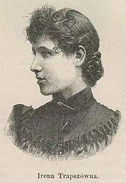 Irena Trapszo była córką Anastazego i Anny Eugenii Walerii z Ćwiklińskich primo voto Gustaw. Urodziła się jako nieślubne dziecko, ponieważ rodzice usankcjonowali związek kilka lat po jej urodzeniu. Już jako dziecko występowała z zespołem ojca na prowincji. Po śmierci matki przyjechała do Warszawy. Występowała w teatrach rządowych w Warszawie, między innymi w Teatrze Rozmaitości i w Teatrze Letnim. W 1907 przeprowadziła się do Lwowa, gdzie została aktorką Teatru Miejskiego. W 1927 przeszła na emeryturę.